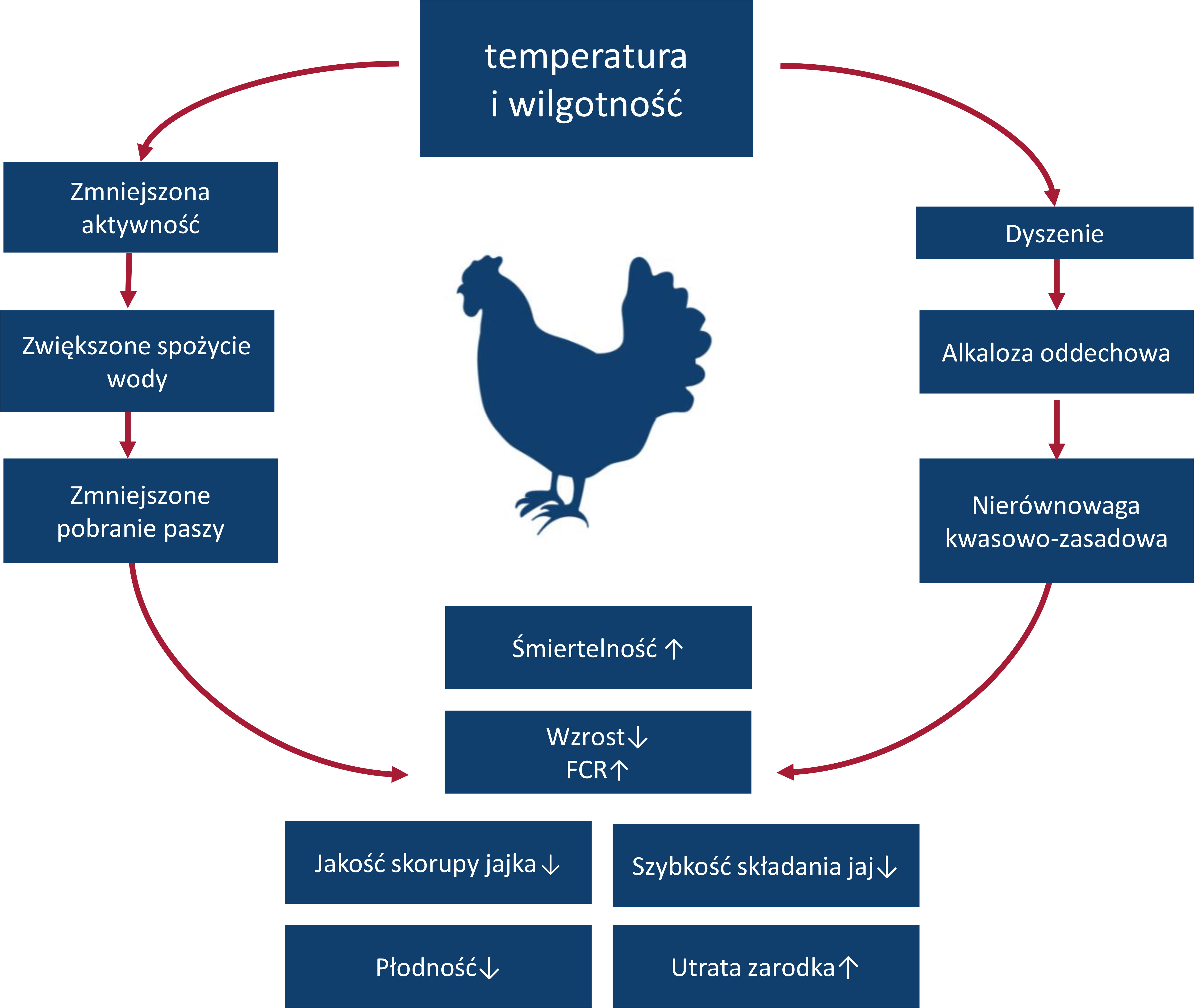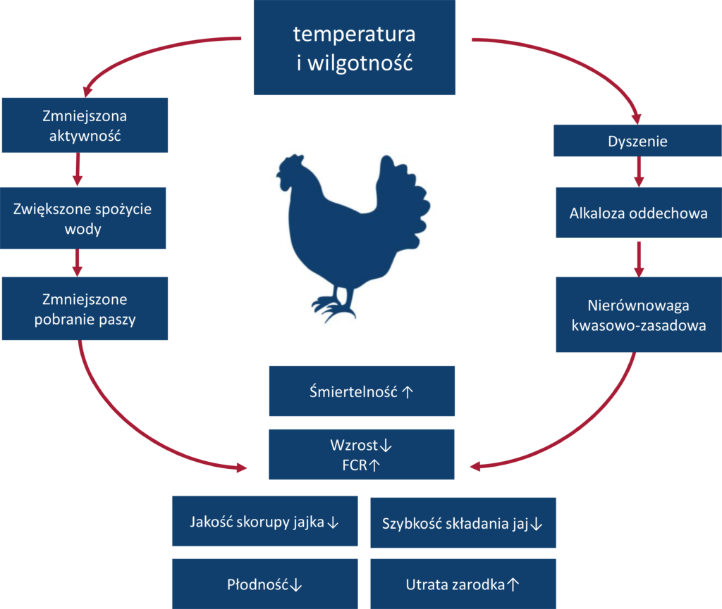 Gdy temperatury rosną, drób ogranicza pobór paszy – u niosek spada przyswajalność nawet o 29% przy skoku z 20 °C do 32 °C, a nieśność może zmaleć o 22%. To z kolei obniża masę jaj i pogarsza jakość skorupek. Dodatkowo: