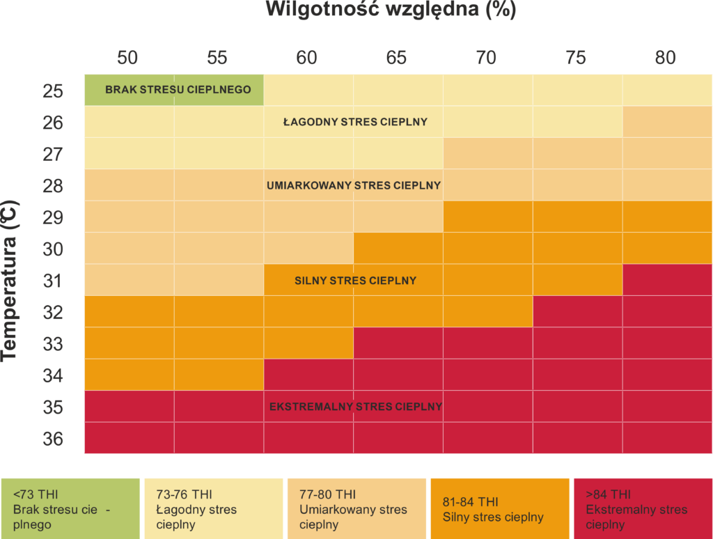 Wykres 1. Percepcja stresu cieplnego u drobiu – indeks termiczno-wilgotnościowy THI (Temperature-Humidity Index)