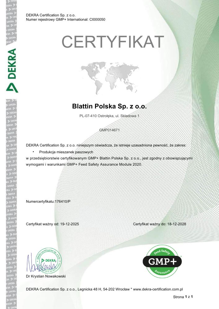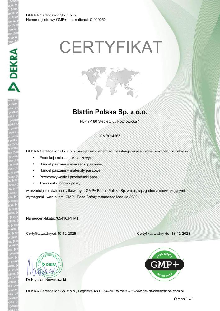 Celem działalności Blattin Polska Sp. z o.o. jest produkcja, dystrybucja oraz transport wysokiej jakości pasz dla zwierząt gospodarskich zgodnie z hasłem „Dla zdrowia Waszych zwierząt” oraz wymaganiami klienta i przepisami prawnymi.