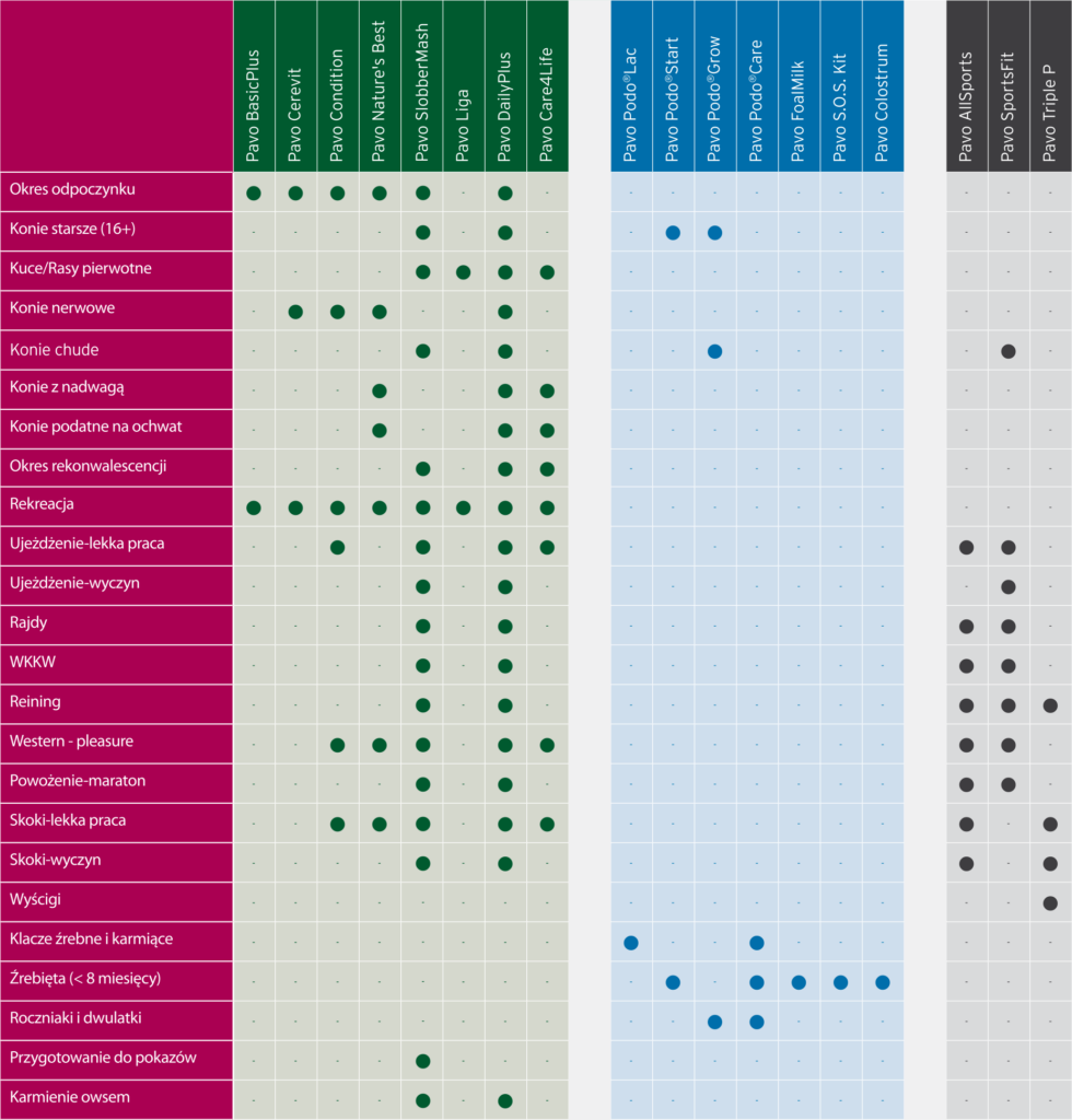 Szeroka gama pasz marki Pavo to produkty dostosowane do różnych potrzeb koni, oparte na badaniach naukowych i praktycznych testach. Są one podzielone na kategorie, aby sprostać specyficznym wymaganiom żywieniowym: